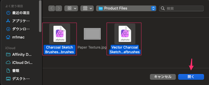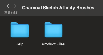 インストールするファイルは、今回の場合ダウンロードした「Charcoal Sketch Affinity Brushes」->「Product Files」の中にある2つのファイルになる。