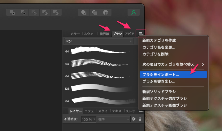 開いたら、ブラシタブの右横にある「横4本線」のアイコンをクリックすると開いたメニューから「ブラシをインポート」を選択して、インストールするファイルを選択。