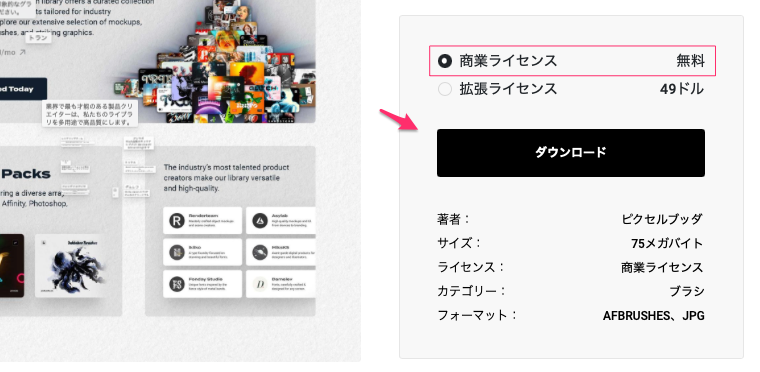 ブラシのインストールを試すために、この「Pixelbuddha」から、Affinity Designer対応ブラシ「Charcoal Sketch Affinity Brushes」をダウンロードしてみる。商用利用可能。