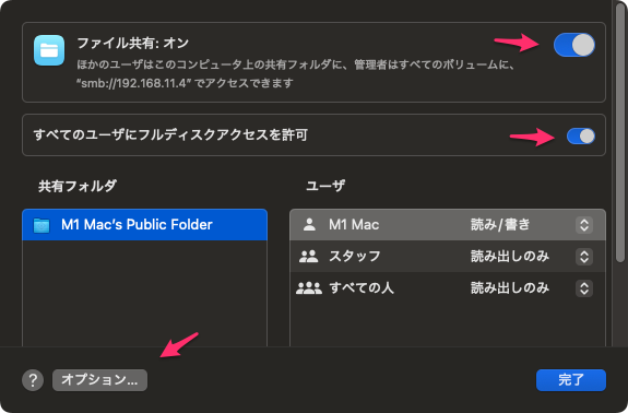 ① ファイル共有をオンにする