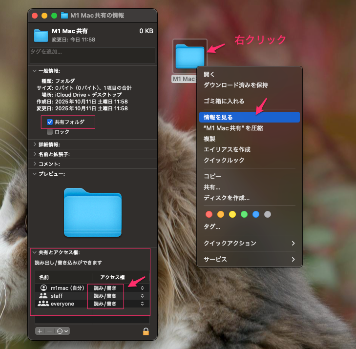 共有したいフォルダを作成して、右クリックで「情報を見る」を選択。