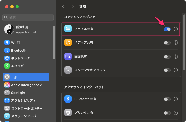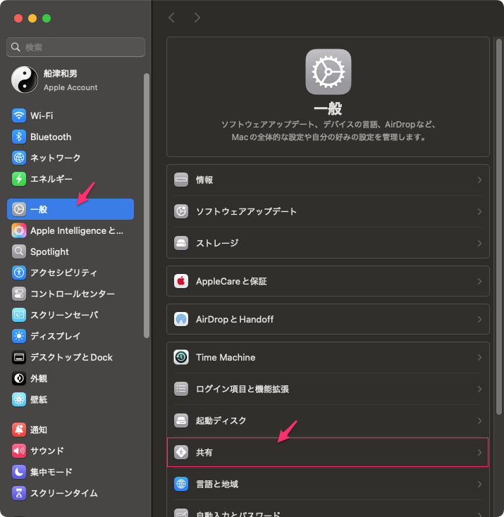 Mac Sequoia の共有設定は、「システム設定」>「一般」>「共有」から設定。