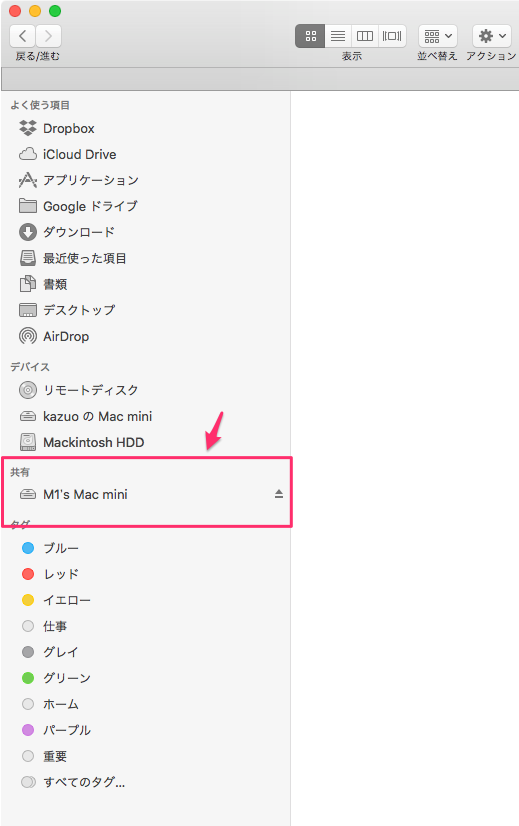 これをクリックすると「M1’s Mac mini」の複数の共有フォルダが表示されるので、今設定したフォルダを開くと接続できる。
