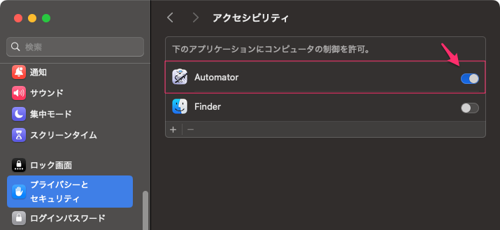 アクセシビリティでAutomatorの制御を許可するように警告する画面が出るので「環境設定を開く」を押す。以下の画面が出るのでオンにする。