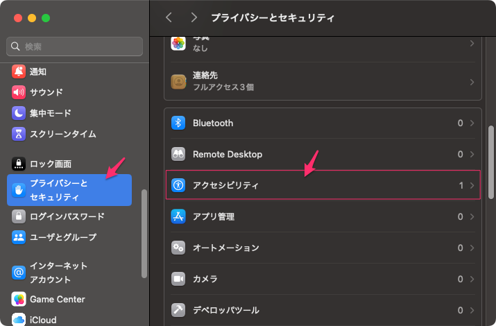 上の問題を解決するには、「システム設定」で「プライバシーとセキュリティ」から許可を設定する。