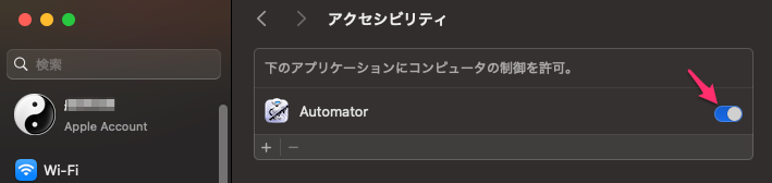 「アクセシビリティ」を開くと、Automaterがオンになっているのを確認する。これで使えるようになる。