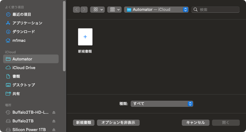 以下は、Automatorの最初の起動画面、中に「新規書類」があるのでダブルクリックして開く。