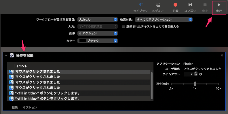 作成が完了したら、右上の実行ボタンをクリックすると、作成したクリックアクションが実行されることになる。
