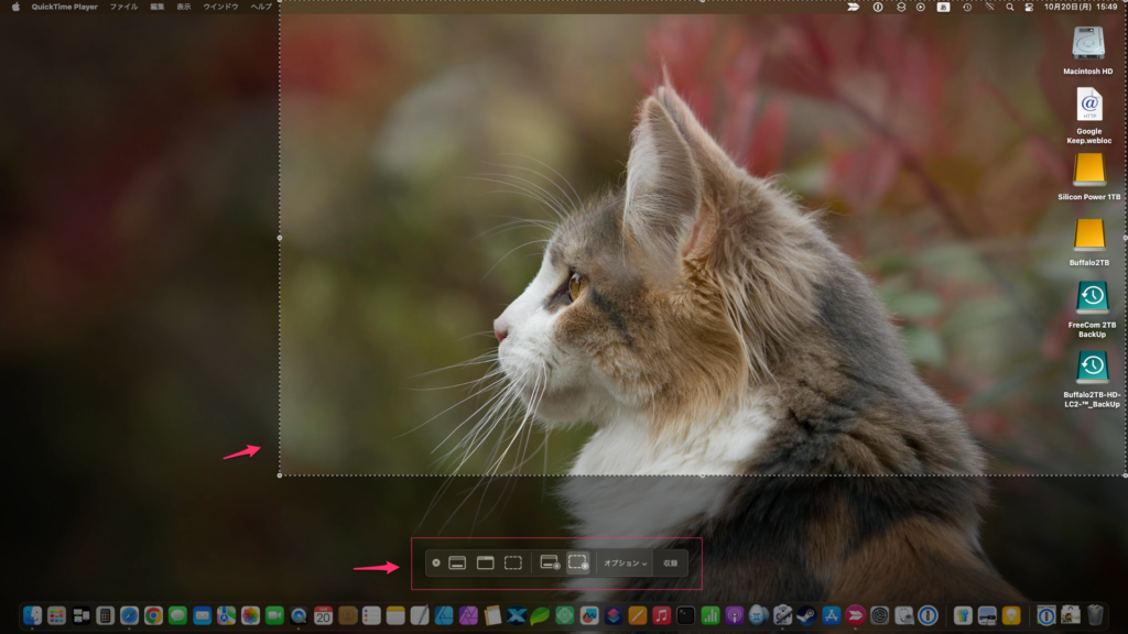 以下のように画面収録する範囲と下の方の右端に「収録」というところを押すと録画スタート。