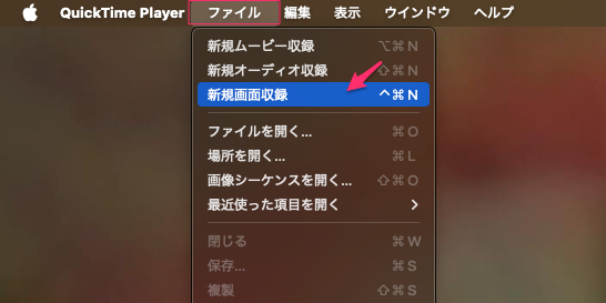 次にメニューから「ファイル -> 新規画面収録」を選択。