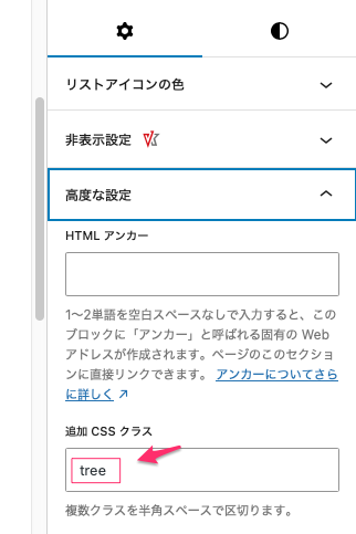 作成したリストを選択、左サイドバーで「高度な設定」を開いて「追加 CSS クラス」にクラス名を設定。