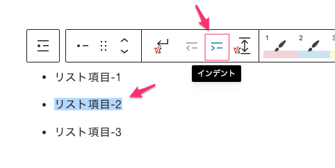 リストを入れ子にするには、まず対象のリスト項目を選択、ツールバーの「インデント」ボタンをクリックする。