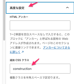 高度な設定で「追加 CSS クラス」を設定する。以下では「construction」と入れている。