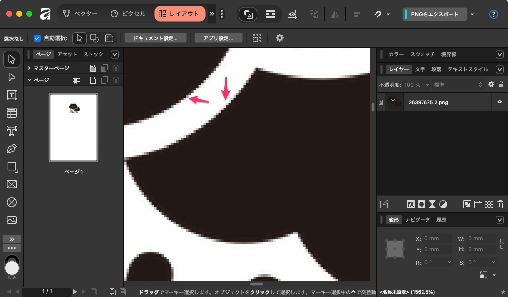 拡大して見てみると明らかにピクセル単位になっていてラスター画像ということが分かる。