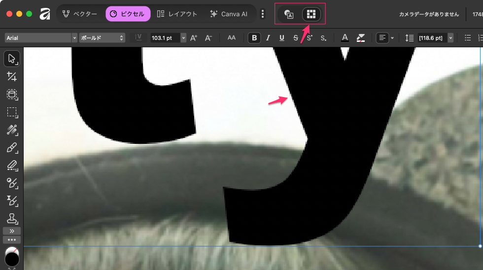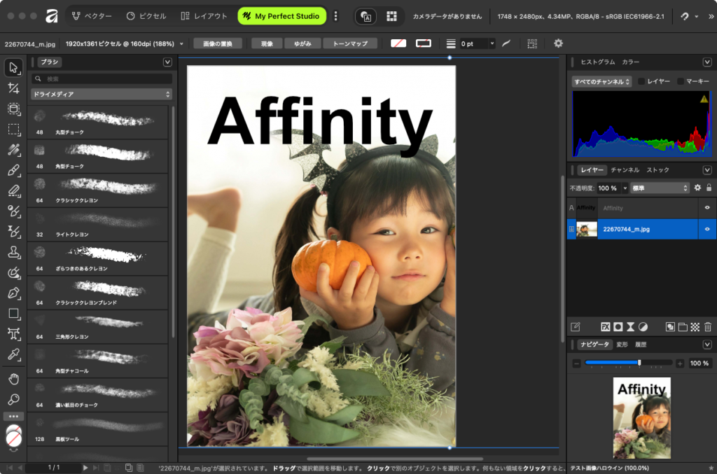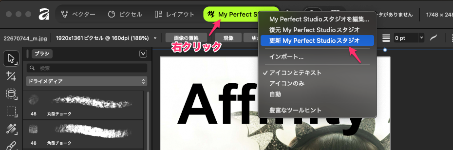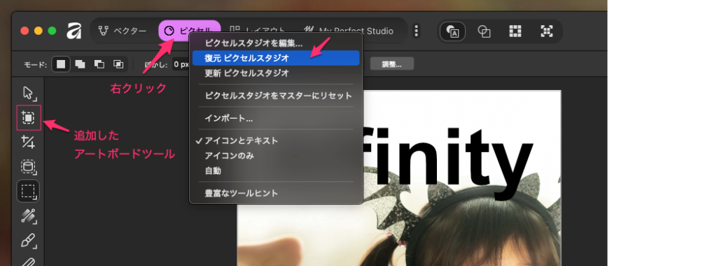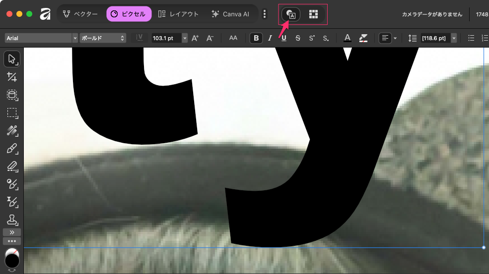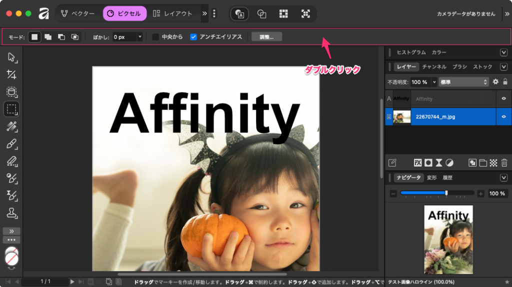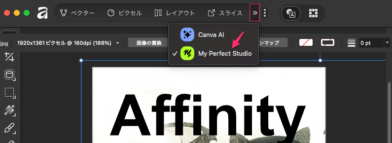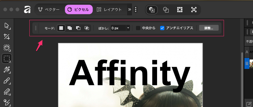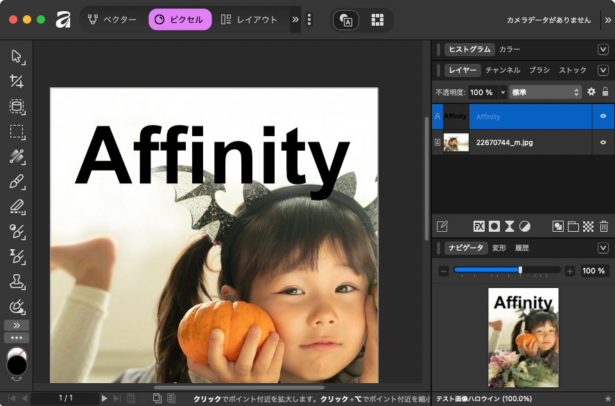 以下の場合は、ピクセルスタジオで画像の上に「Affinity」とテキストを入れている状態である。