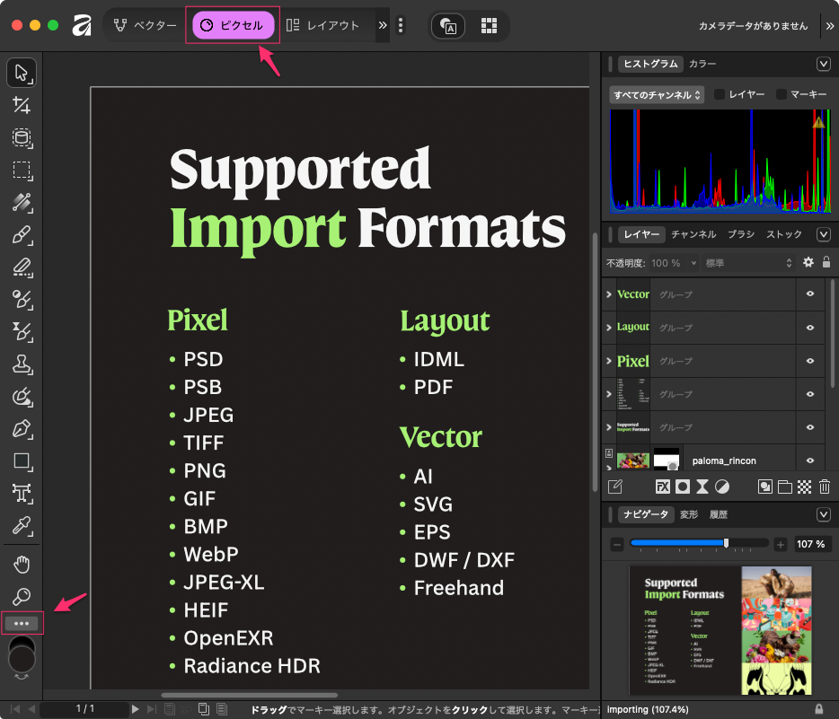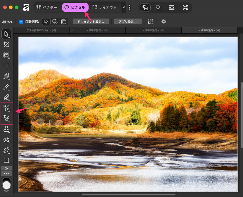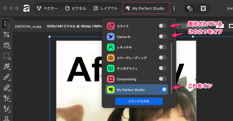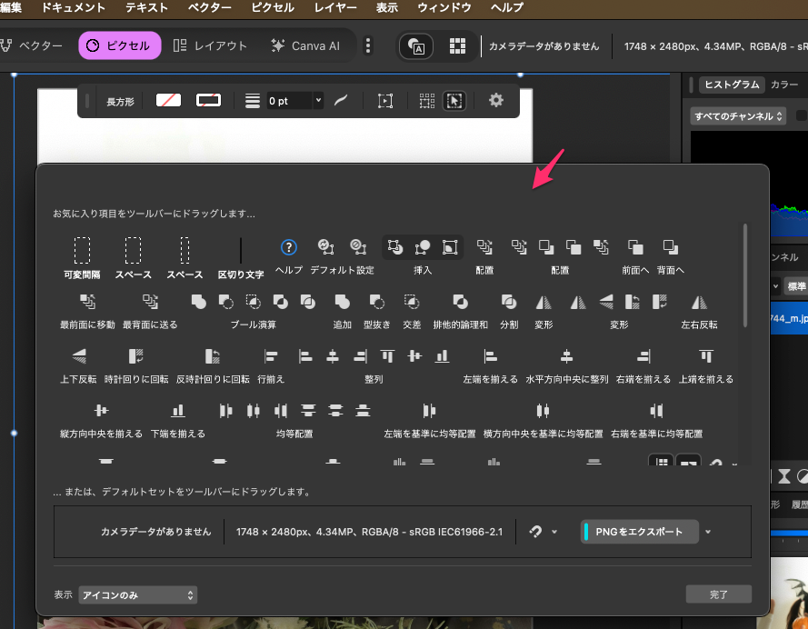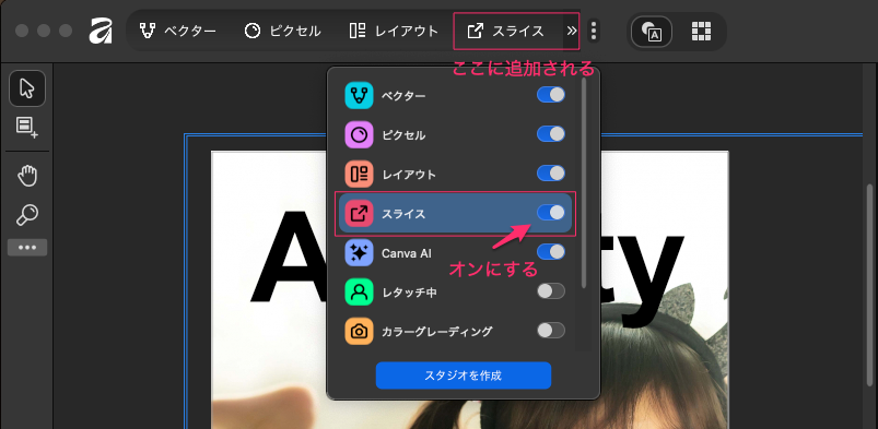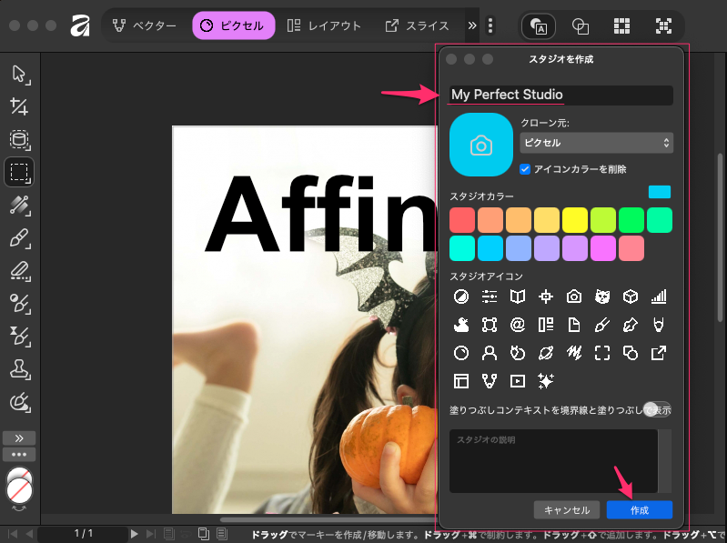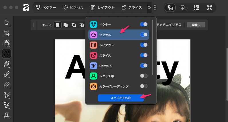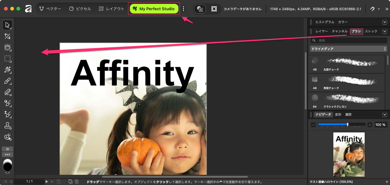 以下の場合は、ピクセルスタジオで画像の上に「Affinity」とテキストを入れている状態である。