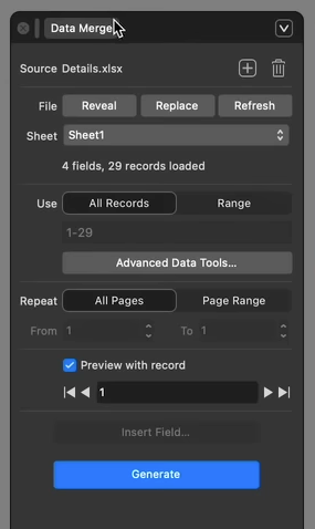 データ結合すると、スプレッドシートまたはCSVファイルの行からドキュメントページを自動的に生成できます。始めるにはデータファイルを追加してください。