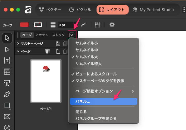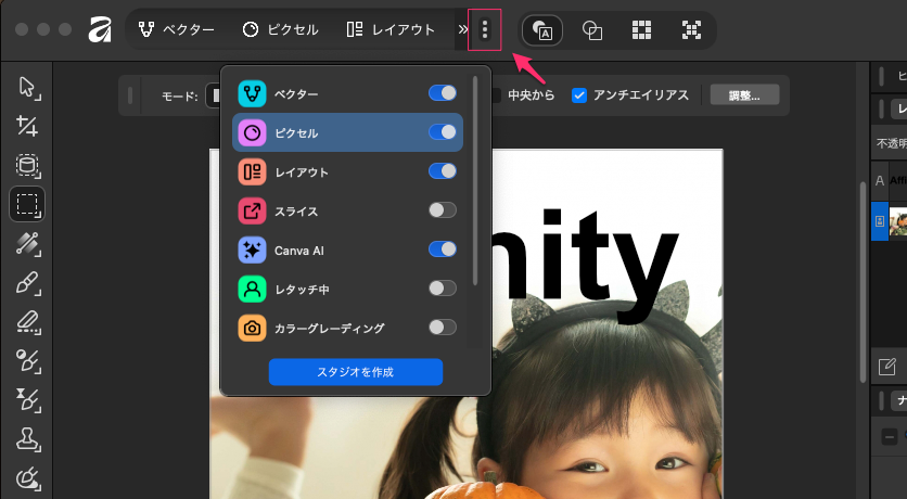 デフォルトでは、Vector Studio、Pixel Studio、Layout Studioとなっている。
