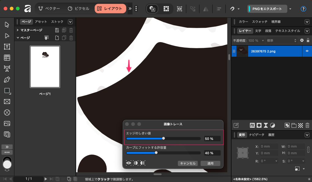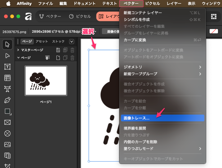 この「ベクター」メニューから「画像トレース」を選択すると、ピクセルからベクターに変換できる様になったのです。