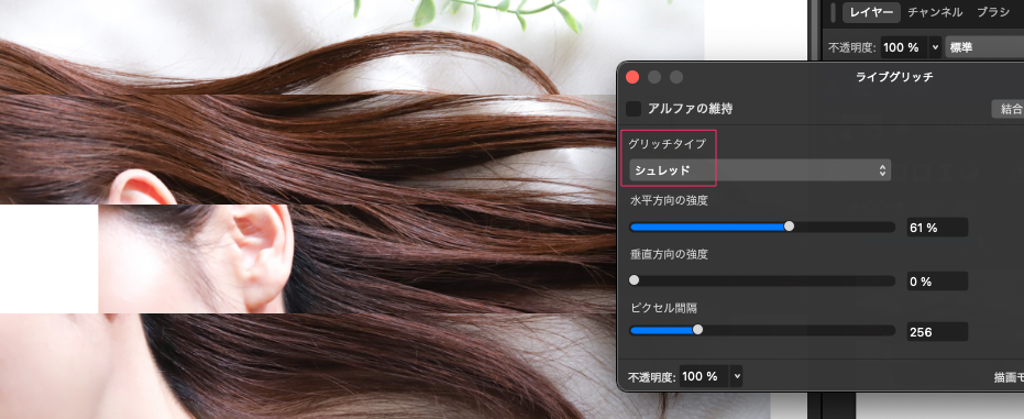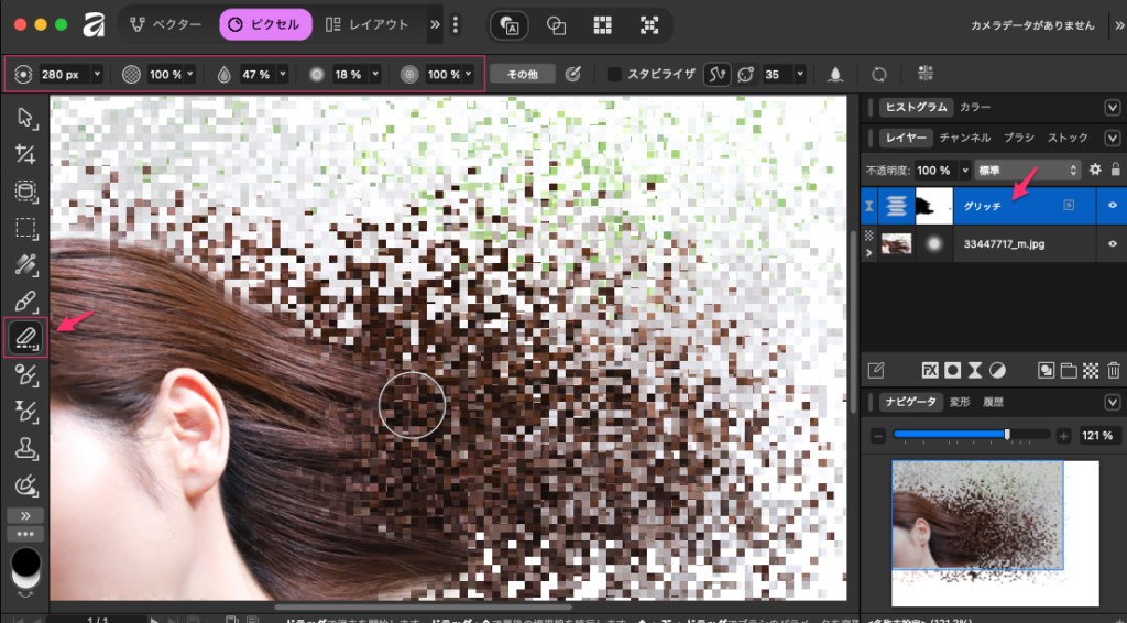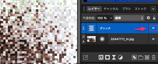 今ブラシを掛けたグリッチレイヤーを選択して、左サイドバーにある「消しゴム」を選択。上のバーで調整しながら消していくと、下の元画像が出てくることになる。