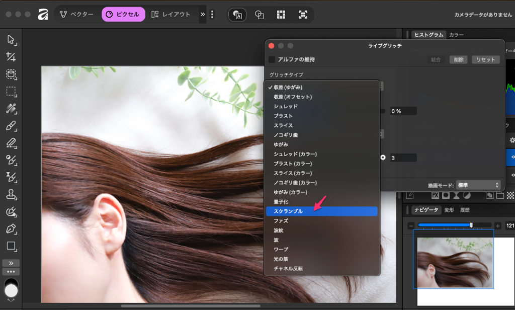 これで髪が溶けていくように見えるかな?これが新しいグリッチフィルターになる。
