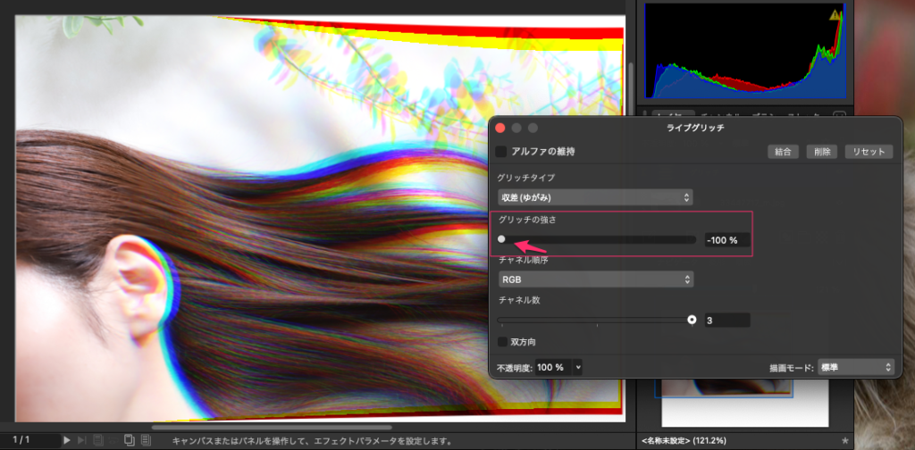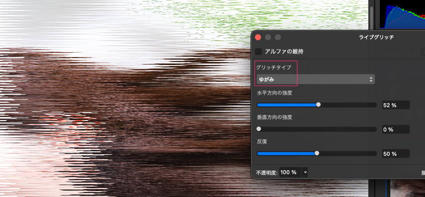 グリッチタイプの「ゆがみ」を使用するとこんな感じ。