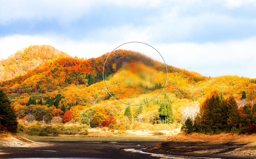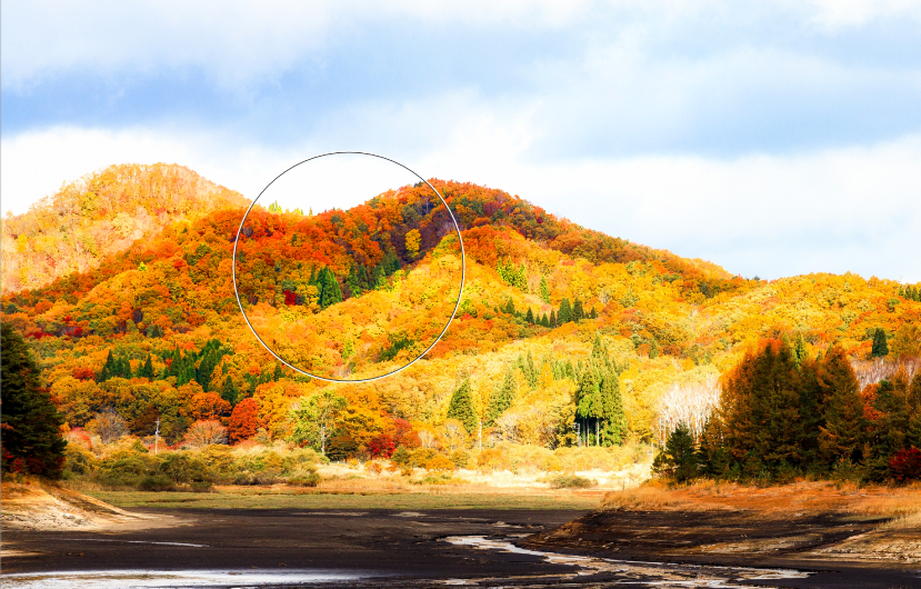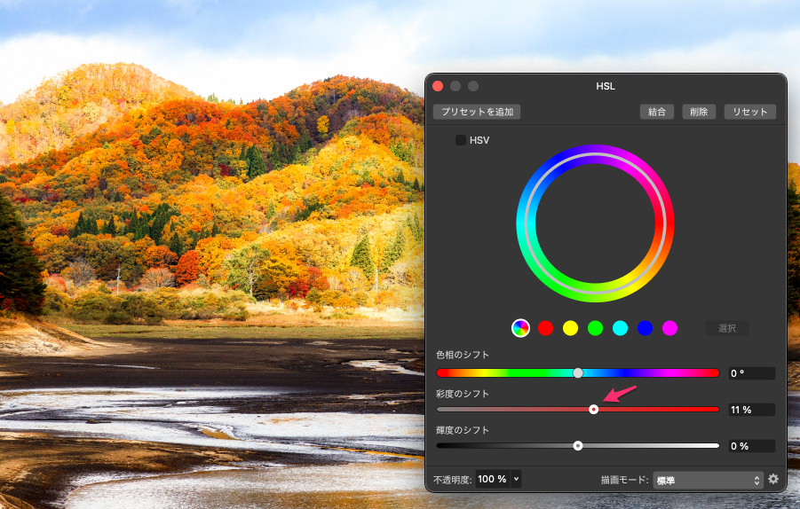 下の右の調整ウインドウで彩度のシフトを少し暗くすると山の色が少し暗くなるのが分かる。