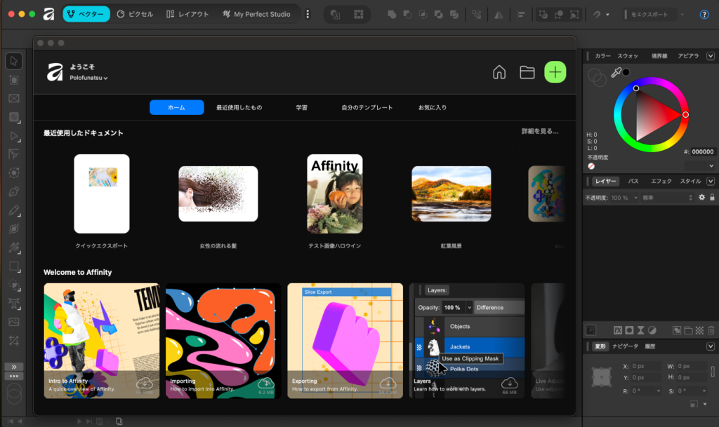 以下は「Affinity」を起動した最初の画面。多少いじくったので、中央の画面が少し違うと思うが以下の様になっている。