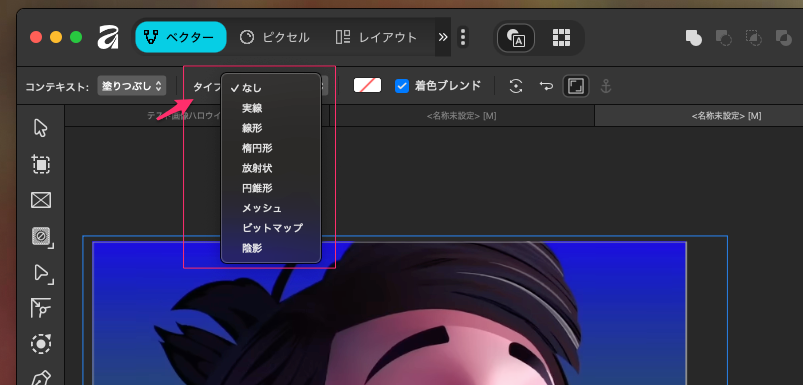 この塗りつぶしツールの他のオプションの1つとしツールバーから「タイプ」を右クリックしてメッシュを選択できる。