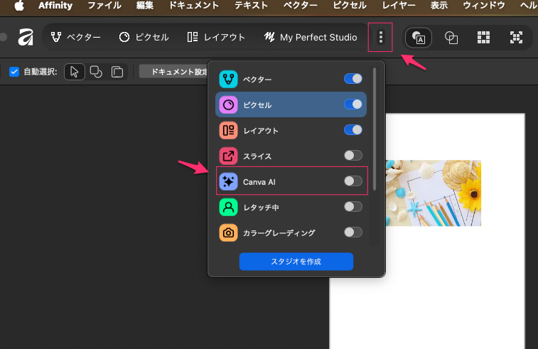 Publisher、Designer、Photoにあったパネルを、どのStudioでも選択できる様になったということ。