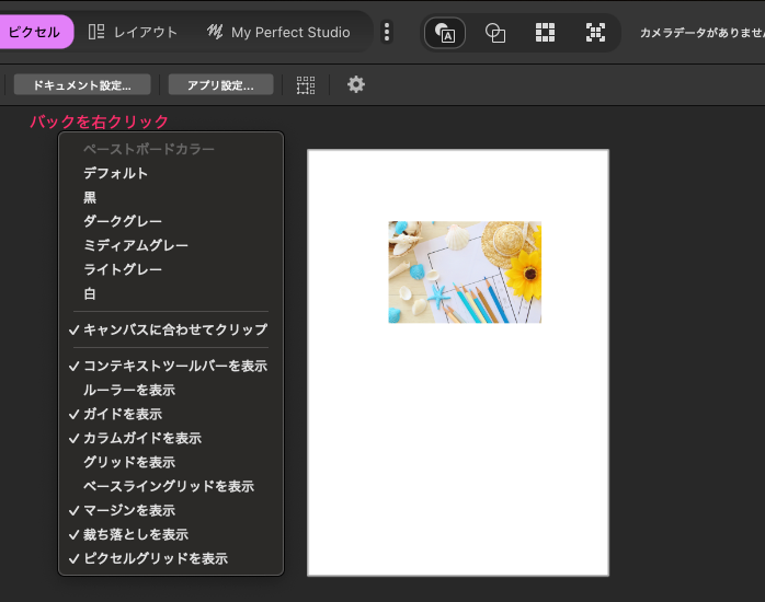 ボードのバックを右クリックするとメニューが開くので色んな機能が使える。