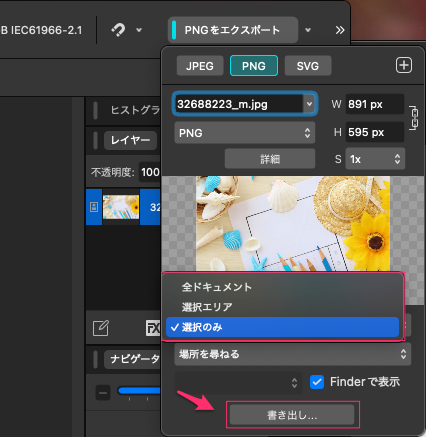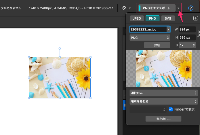 下のPNGをエクスポートの右をクリックすると開く。ここで色んなファイル形式を選択することができる。