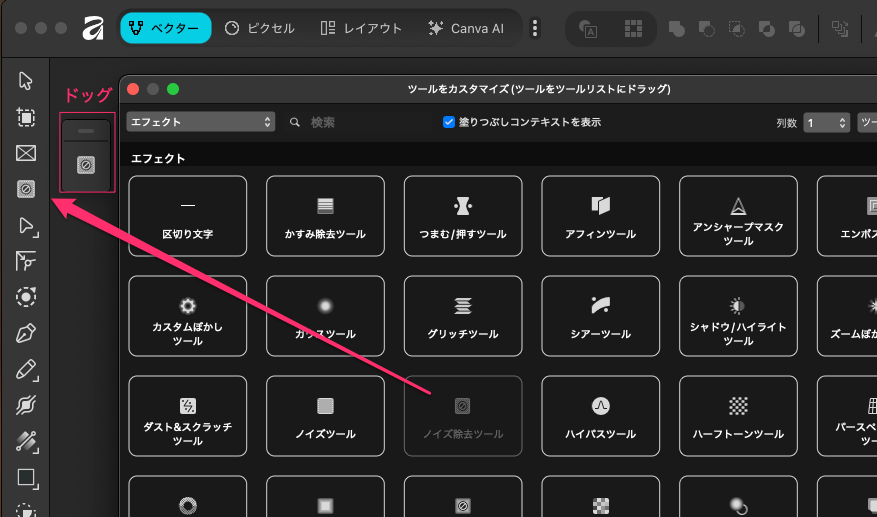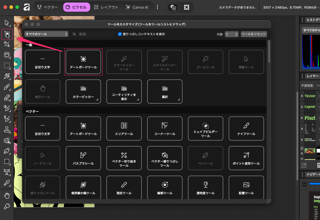例えば、Pixel Studioにアートボードツールが必要だとする。それを以下の様にドラッグして追加するだけ。
