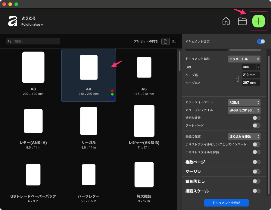 新しいドキュメントを作成し、独自のプリセットを作成するには右上の「+」ボタンから始める。このボタンをクリックすると以下の画面になり、サイズを指定することができる。