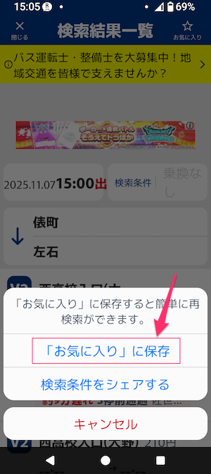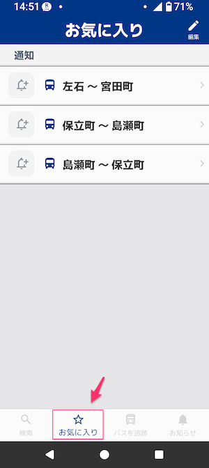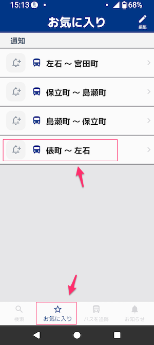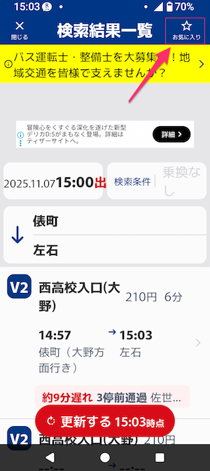 次回からは、検索画面で「お気に入り」タブをクリックして目的のバス停をクリックするだけで表示される様になるので非常に便利になる。
