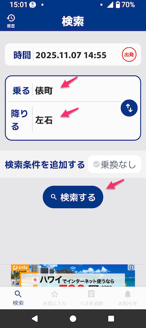 「乗る」「降りる」が入力されたら「検索する」をクリック。