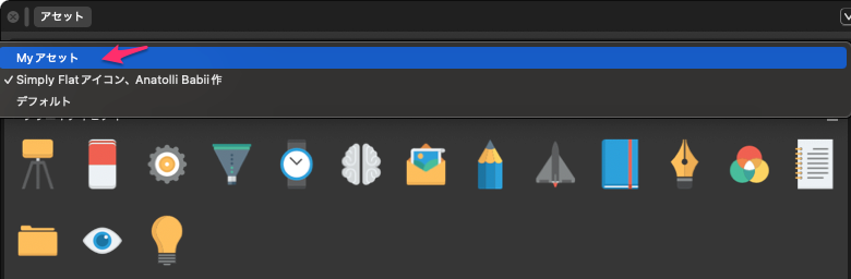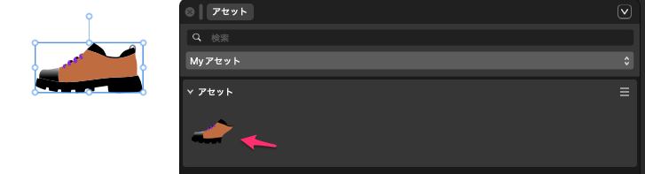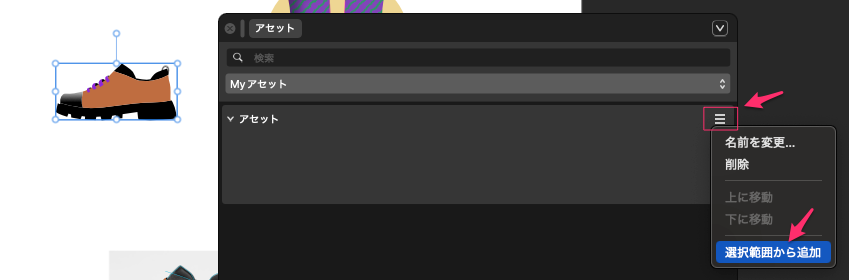 イラストを選択した状態で、アセットの右上の3本ラインをクリックして「選択範囲から追加」を選択すると追加される。