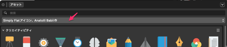 既に作成されている多くのイラストパーツが、アセットパネルに表示されている。