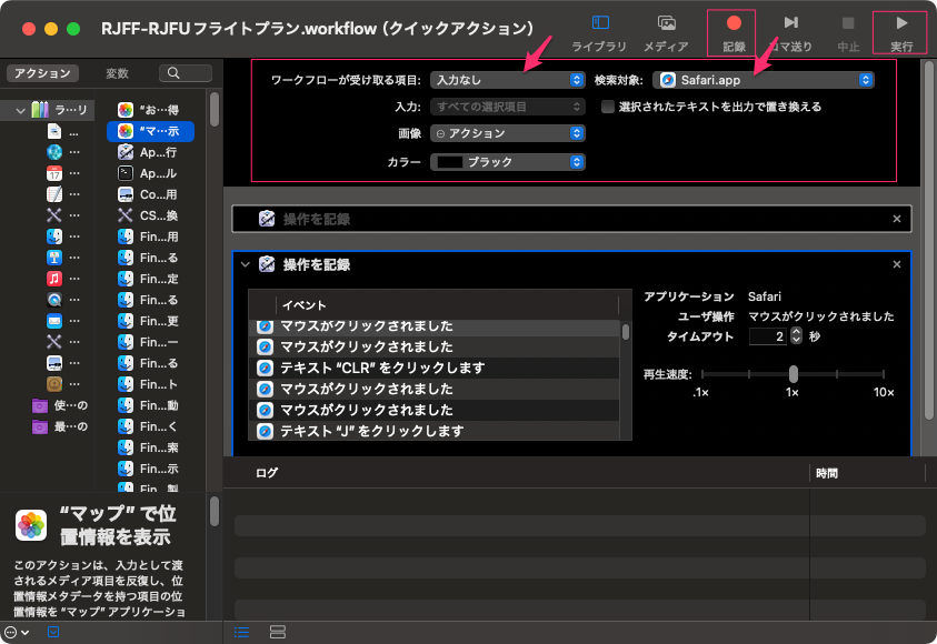 実際の使い方の流れは、オートメーターを起動し、サファリで実際にWebFMC上でクリック設定していき、クイックアクション機能を使ってそれを記録していく。