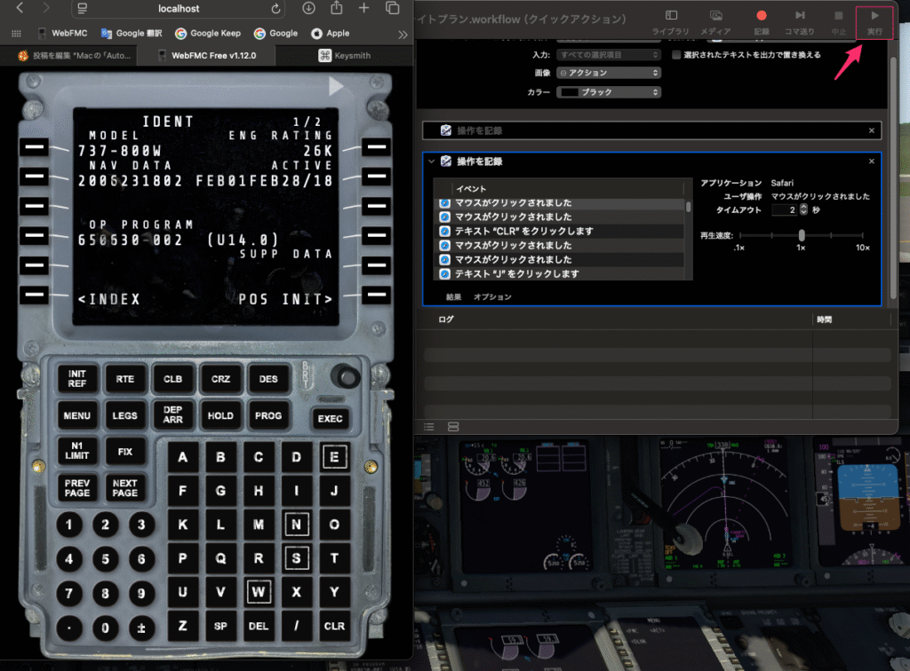 作成されたクイックアクションで、右上の「実行」をクリックすると左にあるWebFMCを自動でクリックしてくれるので、後は見ているだけ。同じFMC設定を何度も使う場合は便利な機能になる。