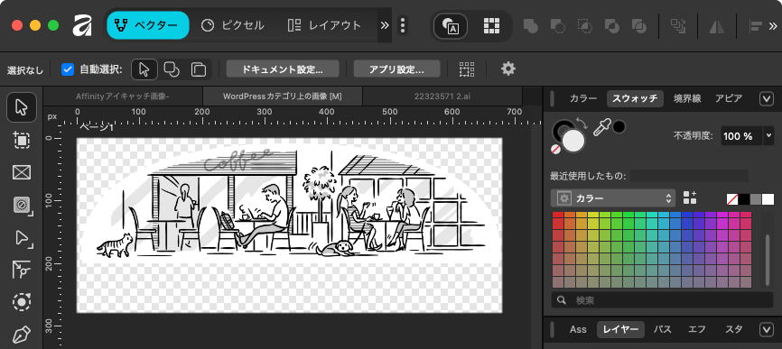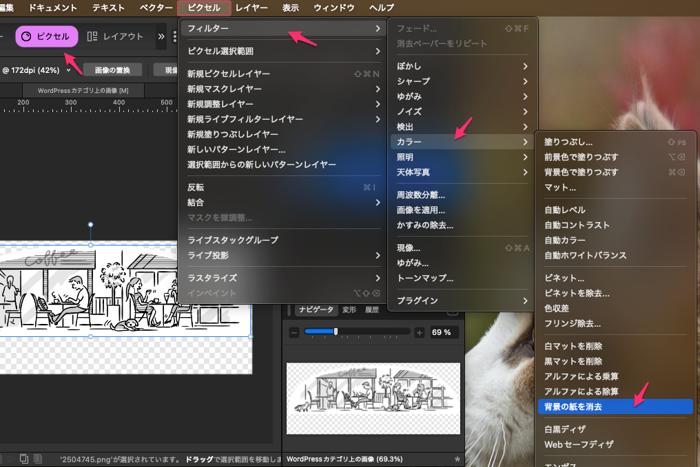 これは下の画像では「ピクセルスタジオ」になっているが、ベクターでもピクセルスタジオでもpng画像を選択して実行すればできた。以下のようにメニューバーの「ピクセル」からできる。
