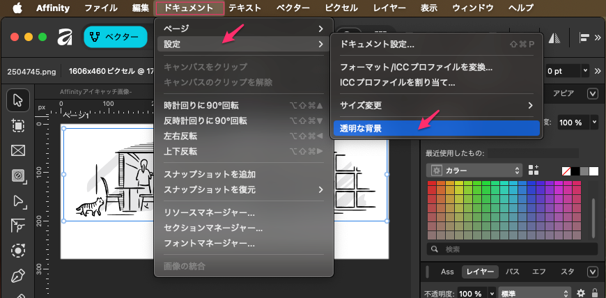 またはメニューからも設定できる。ドキュメント -> 設定 -> 透明な背景。