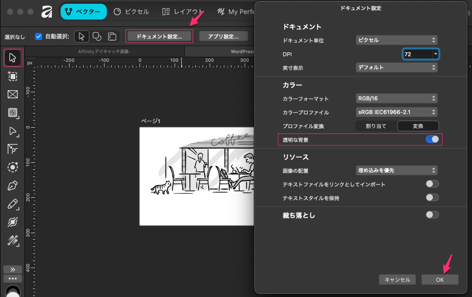 バックの白色を透明にするには「ベクター」「ピクセル」とそれぞれ別々に設定方法が違う。