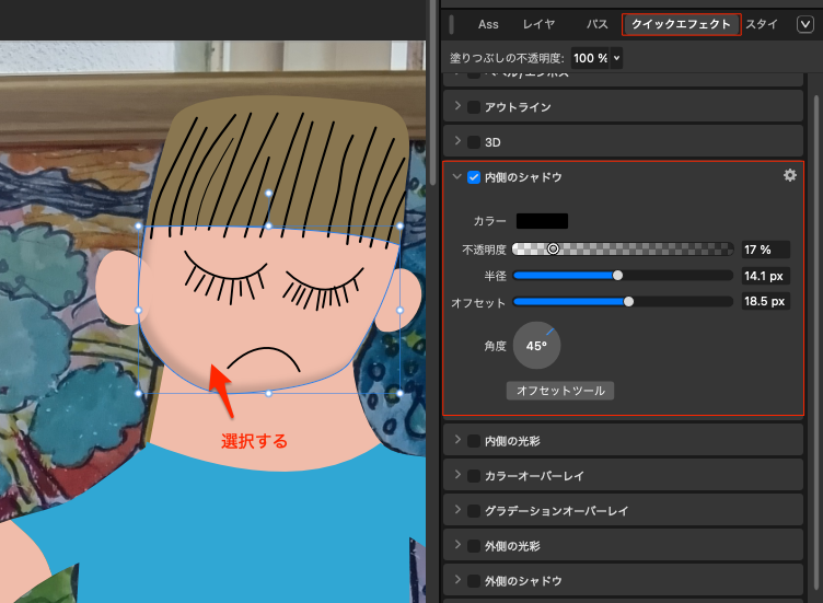 まず顔のところを選択して、「クイックエフェクト」の「内側のシャドウ」で影を作成する。