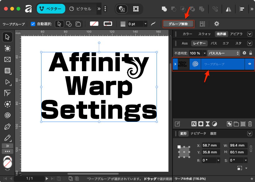 作成された変形は、元のテキスト変形がグループになっているので、コンテキストツールバーにある「グループ解除」をクリックすると変形が解除される。