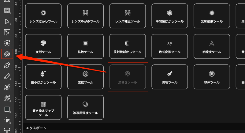 エフェクトのコーナーに「渦巻きツール」があるのでツールパネルにドラッグして入れる。