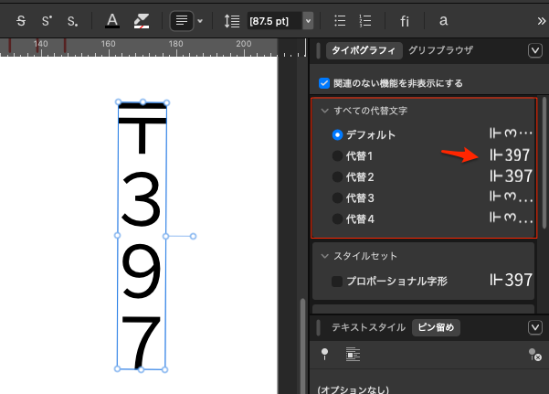イラストレーターではメニューから縦中横を選択するだけでできるが、Affinityでは出来ない。