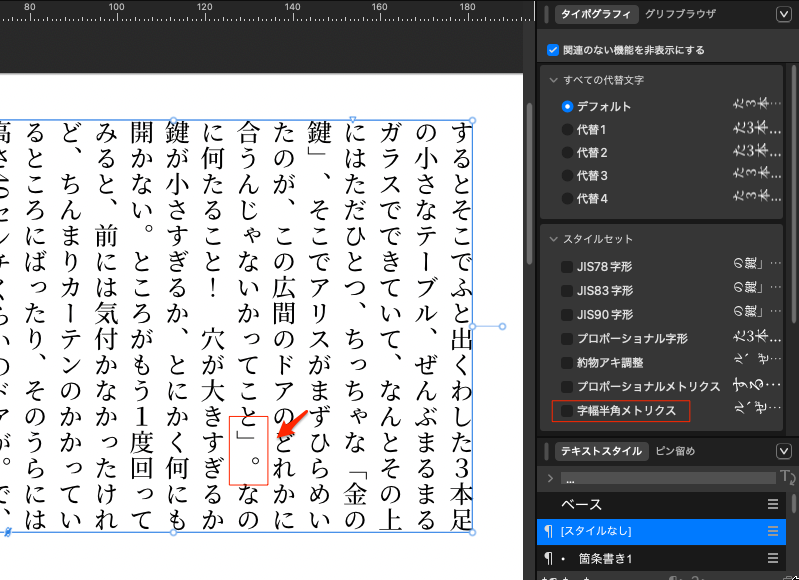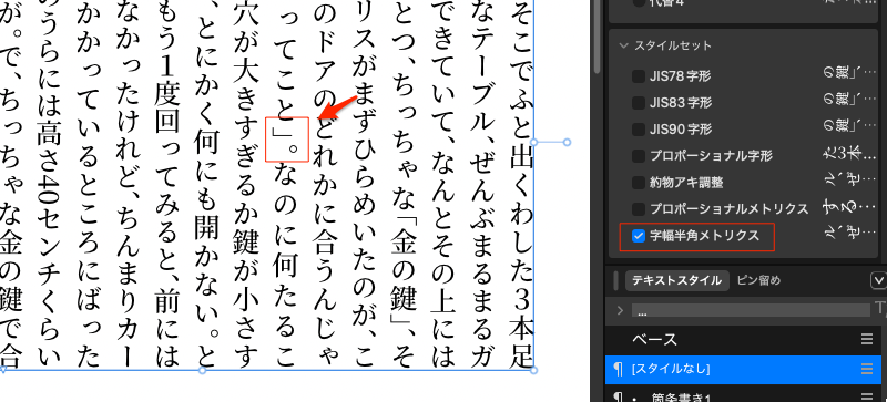 まず、テキストを選択して、右上タブで「タイポグラフィ」を選択、その項目の一番上にチェックを入れるとスタイルセットが表示され、プロポーショナルメトリクスが表示されるようになる。