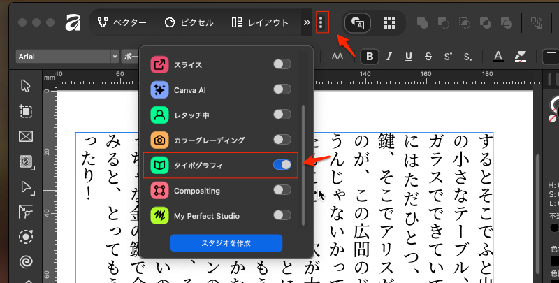 現在、「ベクタースタジオ」で作業をしているが、詰め組の設定は「タイポグラフィスタジオ」が必要になる。多分これは表示されていないと思うので上の「三点アイコン」から「タイポグラフィ」をオンにすると表示されるようになる。