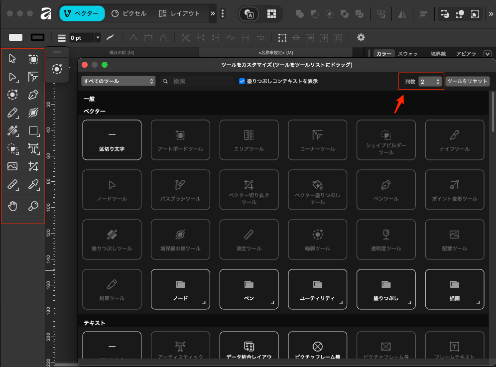 右上の列数を2にすると左サイドツールパネルを2列にすることができる。8列まで指定できる。